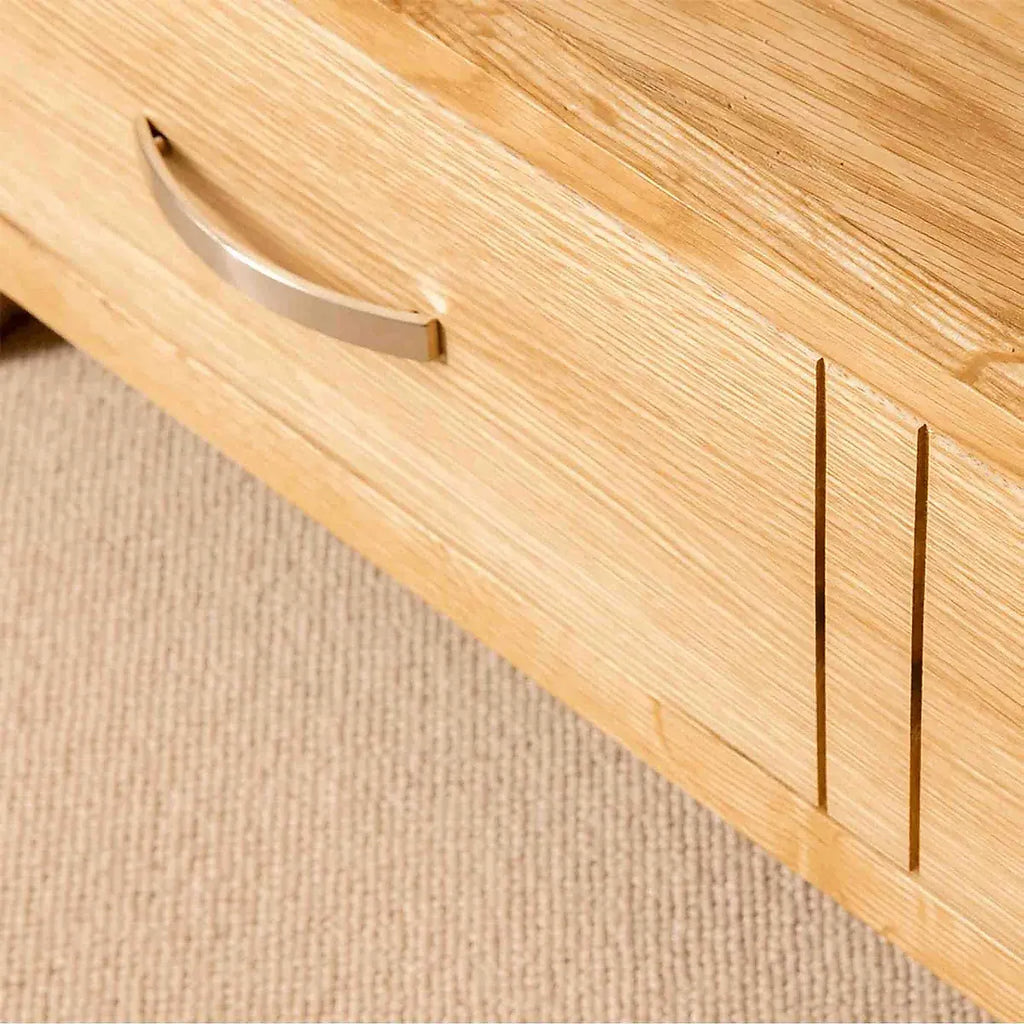 This corner light oak TV stand is modern and offers great value addition to any living space Beautifully constructed from solid oak, solid wood and finished in a lacquered real oak top Features a generously-sized drawer as well as an open shelf 90 cm oak tabletop ideal for screens up to around 40 inches Fully assembled for quick and easy setup This corner TV stand is part of our exclusive London Oak range. Featuring a large drawer below a spacious shelf, there is a hole cut into the back of the unit behind the shelf to allow easy cable management. Crafted from solid oak with solid wood internals the unit provides a modern, contemporary style with its polished metal handles and light lacquered finish. The London Oak range has been designed and created by Roseland Furniture with the aim to bring handcrafted, solid wood items that are designed to last to UK homes at an extremely affordable price. All drawers in the London oak range are crafted with dovetail joints. Polished metal handles add to that contemporary feel and the items are finished with a clear, maintenance-free, lacquer. Solid oak, solid wood, and selected real oak veneers make up the design. Additional Dimensions: Drawers: (H) 13.5cm | (W) 73.6cm | (D) 39cm Shelf: (H) 13.8cm | (W) 76cm | (D) 39cm Side depth: 24cm Angled/Corner depth: 28cm Back width: 50cm